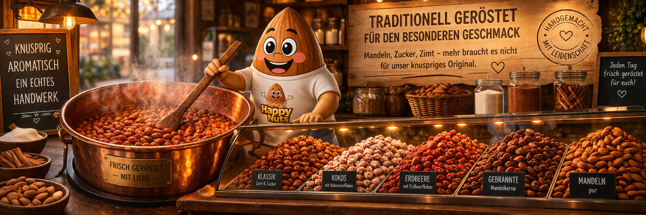 Happy Nuts brings a true taste of traditional German roasted almonds to Dubai. Freshly roasted on-site, our almonds are made with carefully selected ingredients from the local market, including premium-quality almonds, sugar, cinnamon, real coconut, and real freeze-dried strawberries. We use no flavor enhancers and no artificial shortcuts — only authentic ingredients, real fruit, and real craftsmanship. Prepared fresh in front of our customers, following a traditional German recipe, Happy Nuts offers a unique product experience that is truly one of a kind and introduced to Dubai for the very first time.
