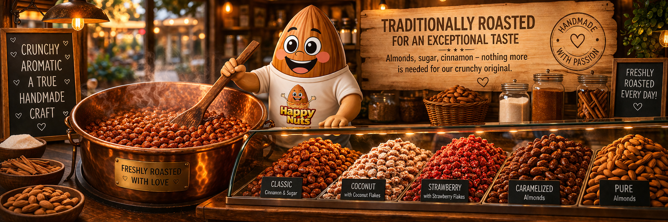 Happy Nuts brings the charm of European roasted almond culture to Dubai. We offer freshly roasted almonds, prepared live on-site, together with other sweet specialties in a warm, festive atmosphere. Our concept combines premium quality, irresistible aroma, and a unique visual experience to create a snack attraction that is both authentic and memorable.